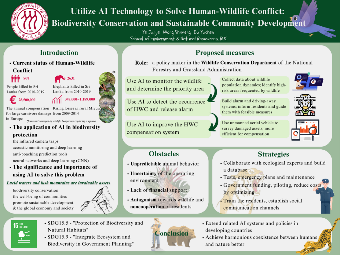 本届“明德立言”高校青年国际胜任力大赛围绕主题“Technology for a better future”展开。在公司孟秀祥教授和研究生路晓平、吴佳忆、周鑫的指导下,Fly Away Home队围绕规定议题“Achieving environmental sustainability and biodiversity with artificial intelligence (AI) technology”,以提案“Utilize AI technology to solve Human-Wildlife Conflict: Biodiversity conservation and sustainable community development”和学术海报的形式,进行了议题分析。