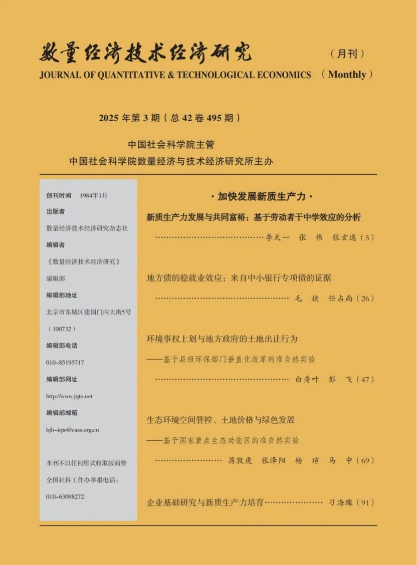 原载:《数量经济技术经济研究》是经济学和管理学权威期刊,AMI权威期刊,国家社科基金首批资助期刊,国家自然科学基金认定“A类期刊”,2024年复合影响因子为16.829,