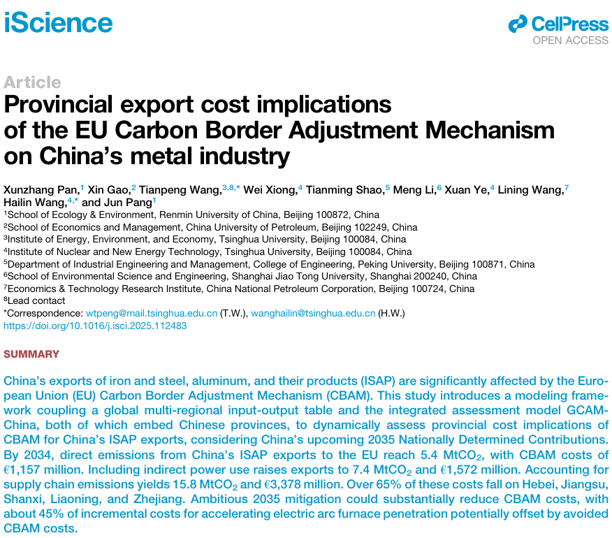 近日,yl7703永利潘勋章副教授作为第一作者,与合作者的研究论文Provincial export cost implications of the EU Carbon Border Adjustment Mechanism on China’s metal industry发表在Cell出版社旗下期刊iScience上。