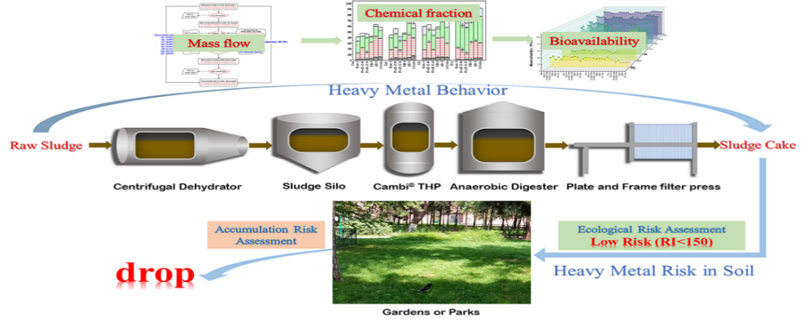 砷、铅、汞、铬、镉等重金属广泛存在于各类环境介质中,对生态环境和人类身体健康造成严重威胁。城市生活污泥作为污水处理的副产物,富集了大量重金属,其行为及去向应重点关注。 “Cambi®热水解+厌氧消化工艺是北京城市生活污泥的主要处理工艺,目前仍缺乏对该工艺过程中重金属的迁移转化规律研究及风险评估,且污水处理厂中污水性质随季节变化,进而影响污泥特性,因此本研究分别于1月、4月、7月、10月沿工艺全流程采样,探讨了该工艺各污泥处理单元(离心脱水、Cambi®热水解、厌氧消化、板框压滤脱水)对重金属的浓度、质量、形态变化的影响,并采用了潜在生态风险指数(RI)和土壤重金属累积预测模型对污泥土地利用时重金属的短、长期风险进行评估。