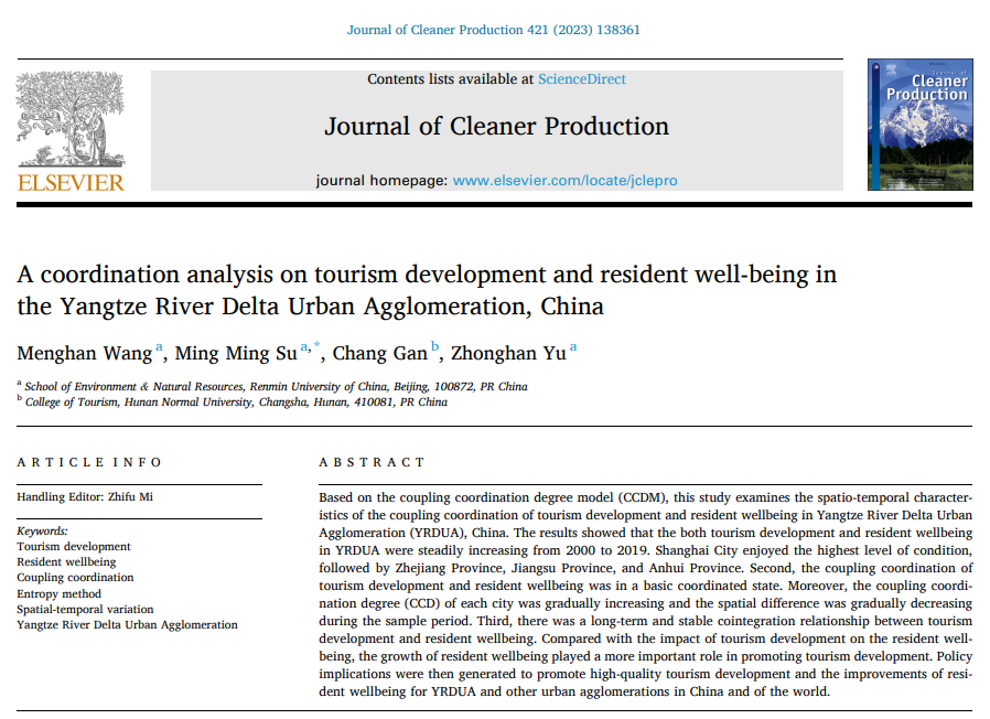 苏明明等:A coordination analysis on tourism development and resident well-being in the Yangtze River Delta Urban Agglomeration, China