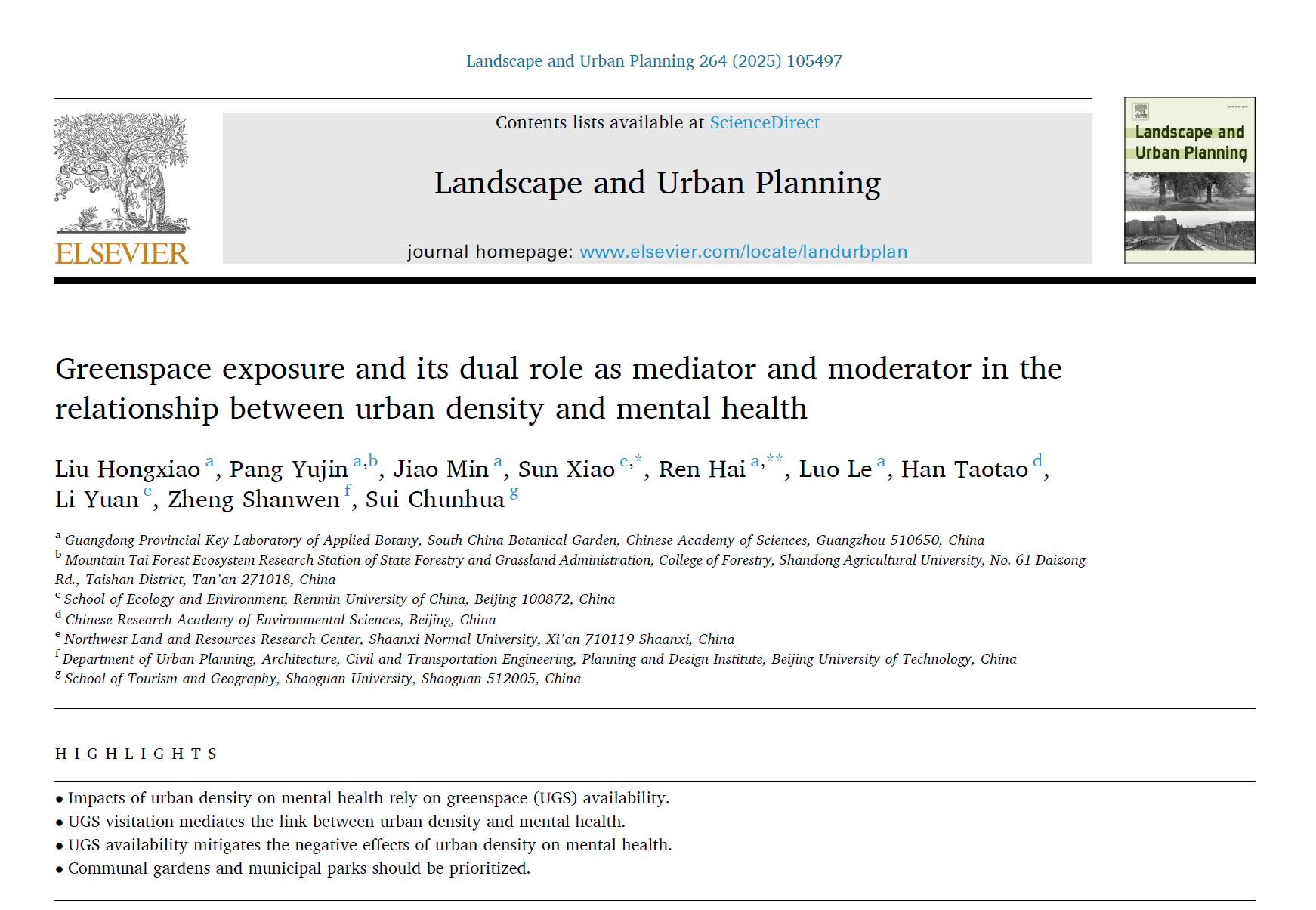 近日,yl7703永利孙晓副教授作为通讯作者,与合作者的研究论文“Greenspace exposure and its dual role as mediator and moderator in the relationship between urban density and mental health”在景观生态学及城市规划领域国际顶级期刊Landscape and Urban Planning发表。