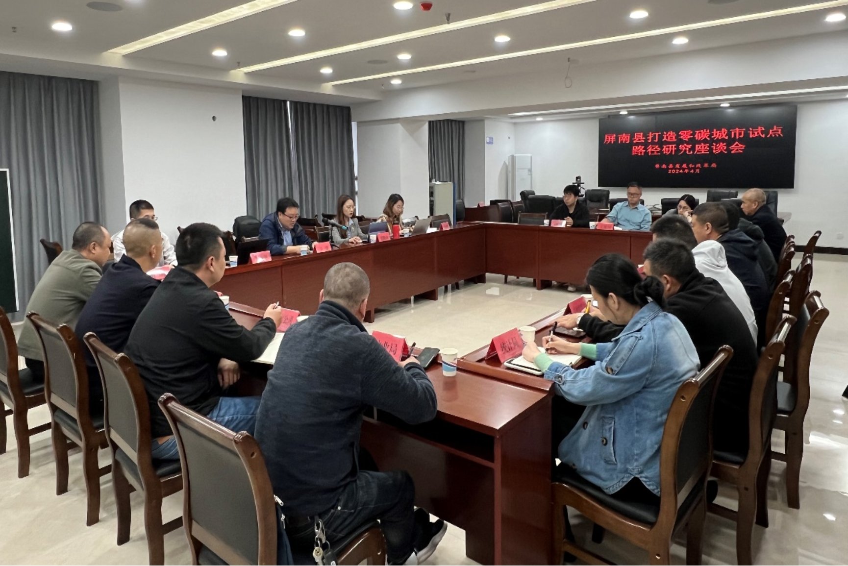 屏南县通过加快绿色低碳生产、提升林业碳汇增量、倡导绿色低碳生活方式等措施积极争创“零碳”示范县。调研小组与屏南县发展改革局、工信局、生态环境局、文旅局、统计局、林业局、供电部门、住建局、农业农村局、自然资源局、城市管理局、工业园区、交警大队等部门相关负责人召开屏南县打造零碳城市试点路径研究座谈会。调研小组与各部门主要负责人就屏南县打造零碳城市的各方面展开了全面深入的讨论与交流,了解了当地的社会经济发展情况、能源结构及产业结构分布情况,重点探讨了屏南县产业布局与政策实施现状、进一步在各领域推动实施低碳零碳政策的问题与难点、未来县域零碳发展的规划重点与亮点等。