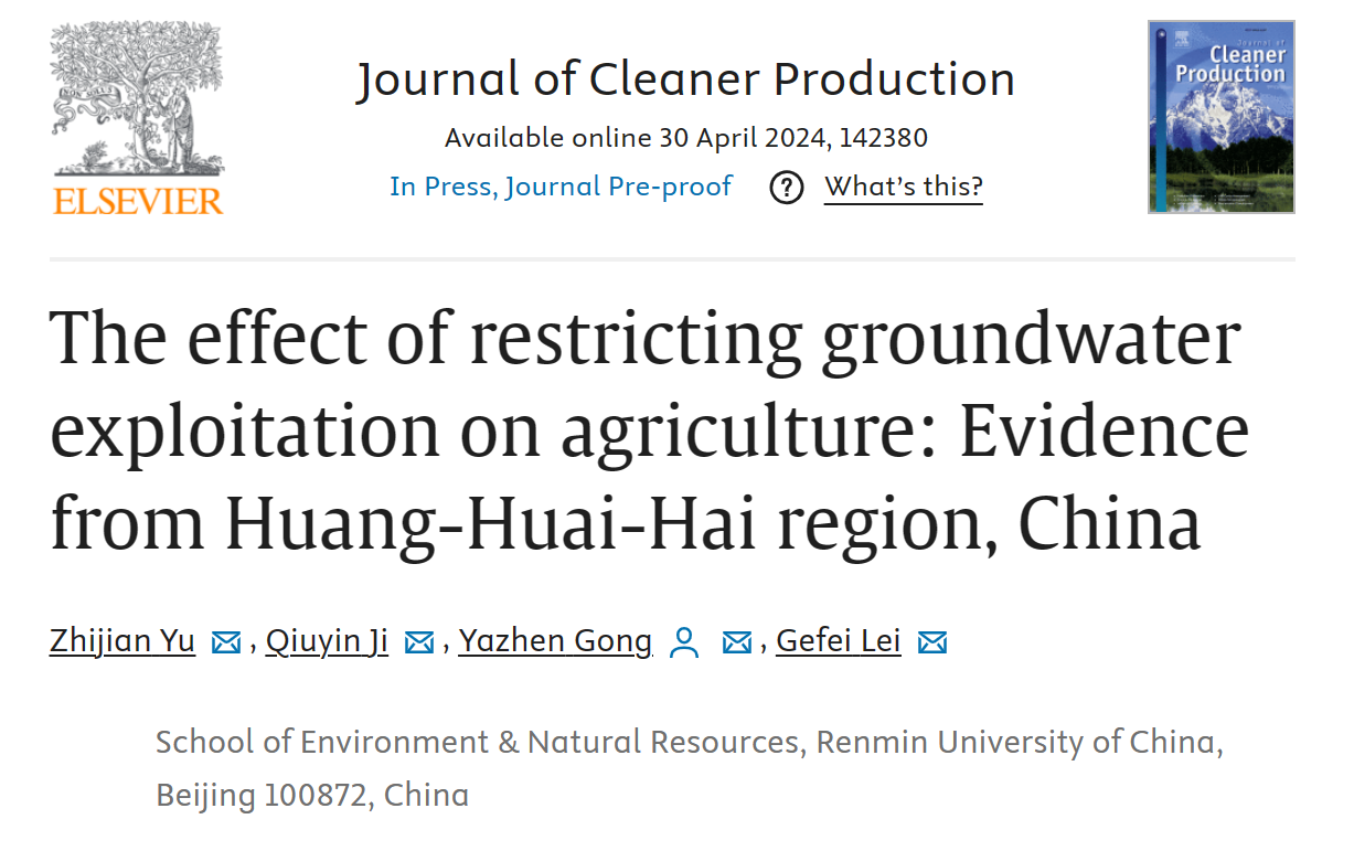 近日,生态环境公司龚亚珍教授团队的研究成果The effect of restricting groundwater exploitation on agriculture: Evidence from Huang-Huai-Hai region, China被国际期刊Journal of Cleaner Production接收。龚亚珍教授为论文通讯作者,团队内本科生季秋吟与博士生喻智健为论文共同第一作者,博士生雷格菲也是作者之一。根据2023年《中国科公司文献情报中心期刊分区表》显示,Journal of Cleaner Production期刊位于环境科学与生态学1区,影响因子为11.1。该工作也是龚亚珍教授主持的国家重点研发计划课题“地下水超采综合治理战略与管控策略”的阶段性成果之一(2021YFC3200500)。