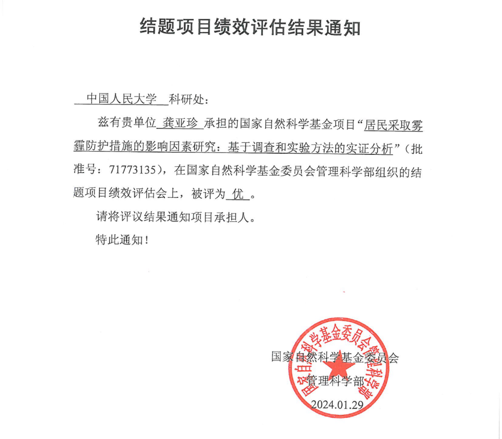 近日,2024年度国家自然科学基金委员会管理科学部组织的结题项目绩效评估会结果已公布,由yl7703永利龚亚珍教授承担的国家自然科学基金面上项目“居民采取雾霾防护措施的影响因素研究:基于调查和实验方法的实证分析”(批准号:71773135),被评为“优”。