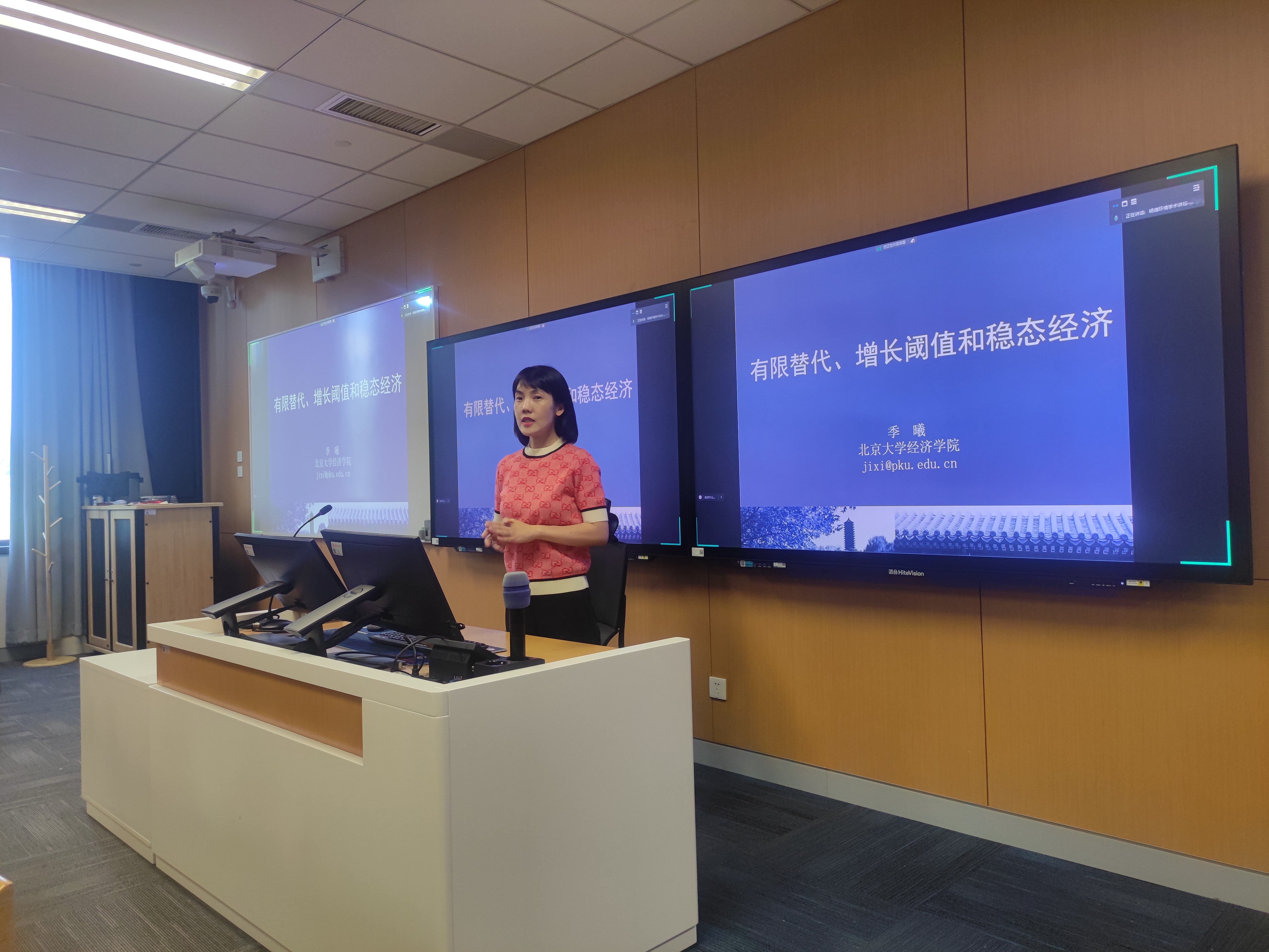 在交流讨论环节,多位师生针对学术报告中关于稳态增长概念、结构和规模的关系、效率和创新的关系、经济-环境-社会层面指标的构建、可再生资源与不可再生资源的替代性以及生产要素模型和环境可持续性之间的关联与季曦教授进行了深入探讨,气氛活跃,师生反响热烈。