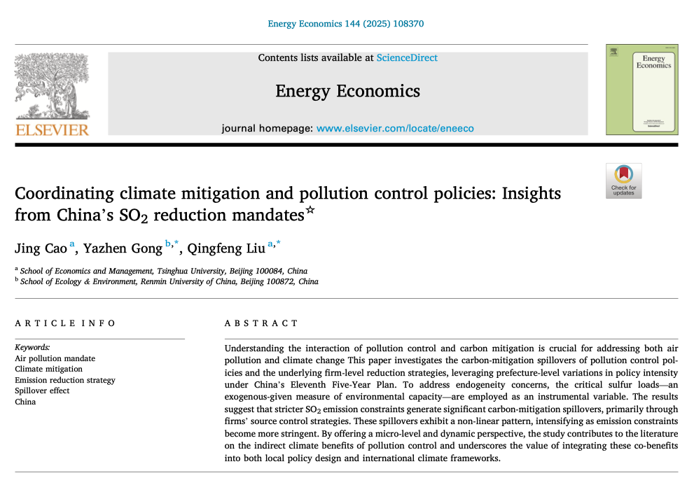 Cao J, Gong Y, Liu Q. Coordinating climate mitigation and pollution control policies: Insights from China's SO2 reduction mandates[J]. Energy Economics, 2025: 108370. https://doi.org/10.1016/j.eneco.2025.108370