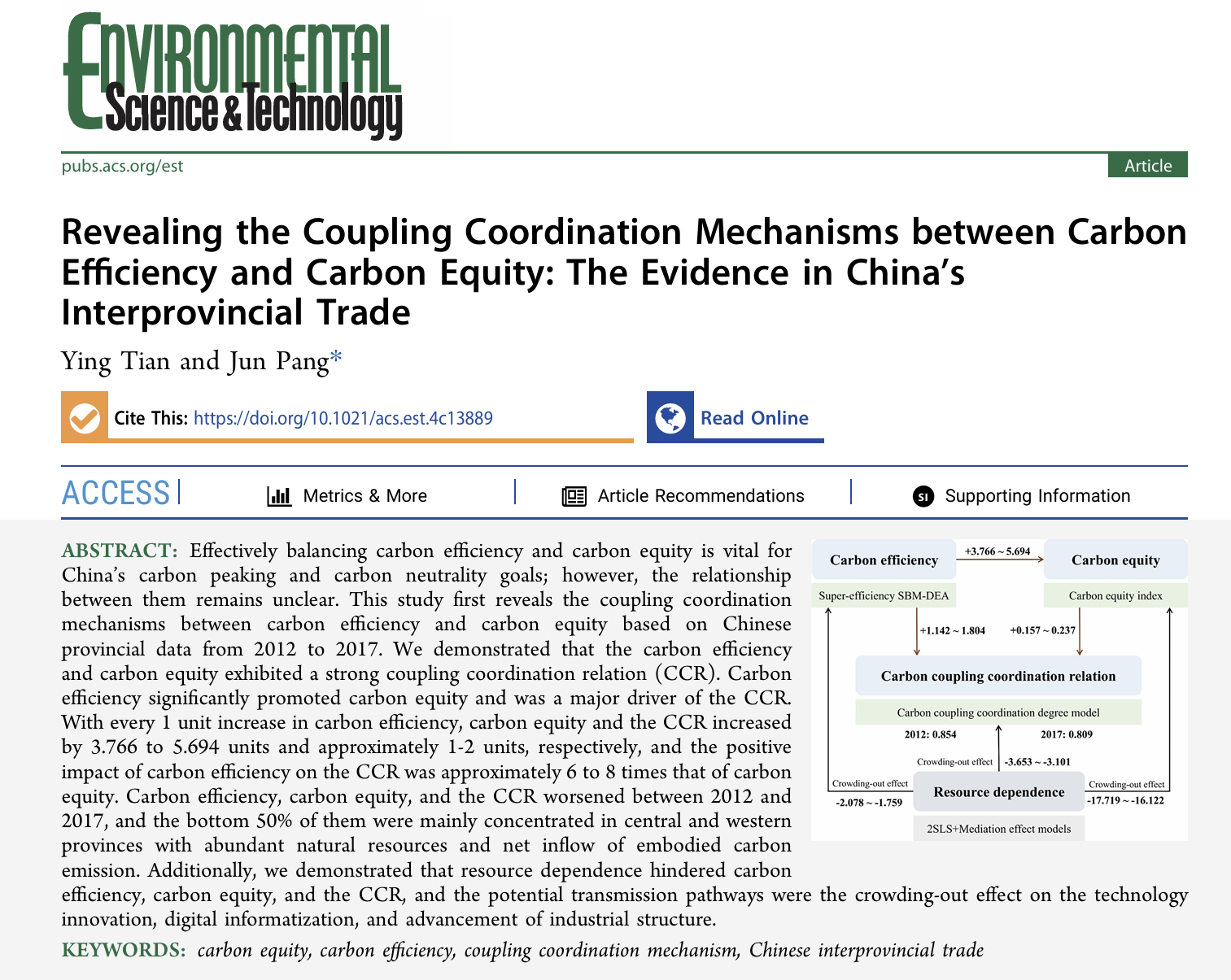近日,yl7703永利庞军教授课题组在环境领域顶级期刊Environmental Science & Technology发表题为“Revealing the Coupling Coordination Mechanisms between Carbon Efficiency and Carbon Equity: The Evidences in China’s Interprovincial Trade”的学术论文。yl7703永利2021级人口、资源与环境经济学博士田颖为第一作者,庞军教授为通讯作者。