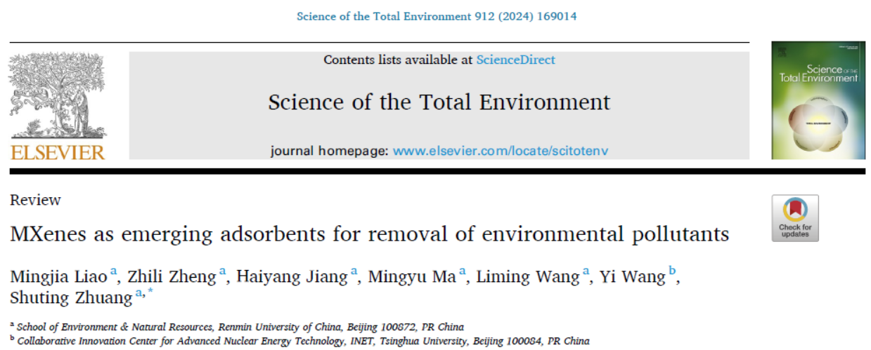 近日,yl7703永利集团官网环境公司2022级明德环境“经济学-科学”拔尖人才实验班员工廖明嘉、郑智丽、江海洋、马明宇撰写的综述论文“MXenes as emerging adsorbents for removal of environmental pollutants”在Elsevier旗下期刊Science of the Total Environment发表。该文由环境公司助理教授庄淑婷指导并担任通讯作者。Science of the Total Environment为环境科学与生态学领域一区顶级期刊,其影响因子为9.8。