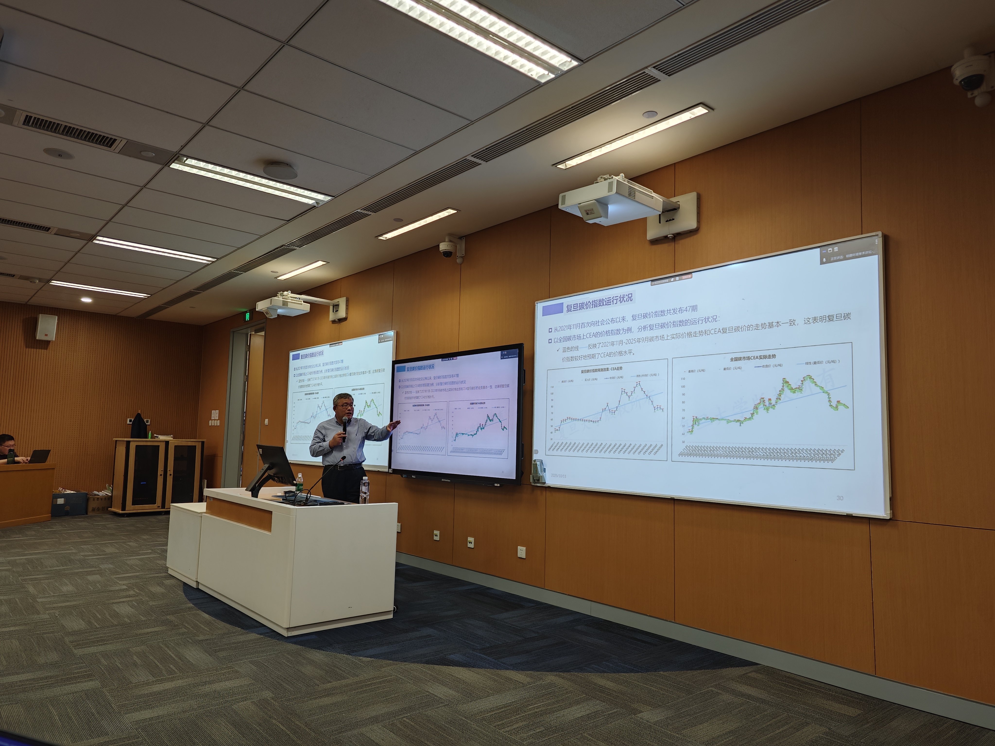 接下来,陈诗一教授分析了中国碳市场的运行现状与优化方向。他表示,中国碳市场自启动以来已平稳运行四年,为碳减排提供了市场化定价机制,但当前碳价偏低、覆盖行业有限等问题仍需通过制度完善加以解决。由其科研团队参与研发的“复旦碳价指数”,能够为企业碳资产管理提供精准的价格参考,助力企业提升碳成本管控能力。同时,他建议将企业碳资产管理纳入财务报表体系,并建立碳信用评级制度,为转型期企业提供差异化融资支持,推动碳资产成为企业核心价值的重要组成部分。