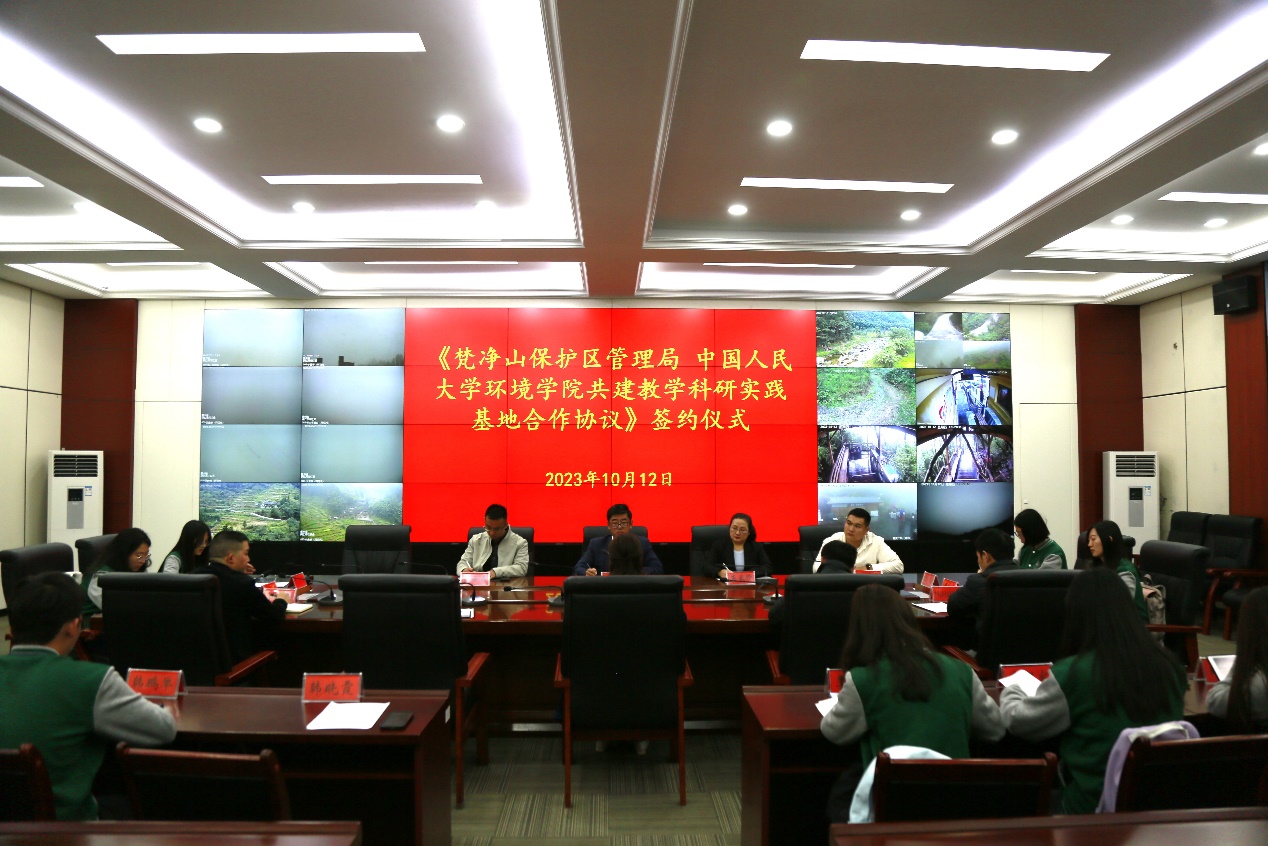 最后,调研团队与梵净山管理局领导在梵净山管控平台开展了“梵净山保护区管理局 yl7703永利集团官网环境公司共建教学科研实践基地合作协议”签约座谈会。yl7703永利集团官网环境公司党委书记贾铁英老师和梵净山管理局杨妮副局长代表双方签订了合作协议,双方在生态文明建设领域的教学实践、人才培养与科研交流等方面达成战略合作。调研团队师生和梵净山管理局工作人员关于梵净山自然保护区的保护现状、管理体系、规章制度、生态旅游、社区工作、科研工作等多方面内容进行了交流讨论。