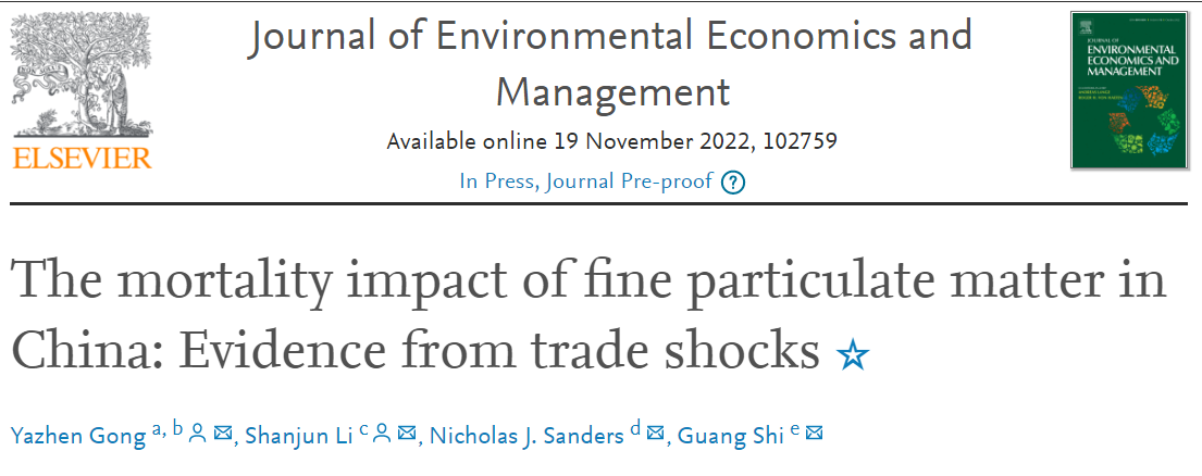 2022年11月19日,yl7703永利集团官网环境公司龚亚珍教授与其合作者的研究成果“The Mortality Impact of Fine Particulate Matter in China: Evidence from Trade Shocks”在资源与环境经济学领域顶级期刊Journal of Environmental Economics and Management(JEEM)在线发表。