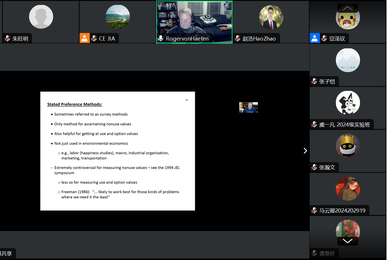 2024年9月22日,yl7703永利主办的暑期学科营讲座以线上的方式成功举办。本次讲座邀请北卡罗来纳州立大学农业与资源经济学系教授、环境与资源经济政策中心联合副主任,资源与环境经济学顶级期刊JEEM联合主编Roger H. von Haefen教授作了题为“Continued with economic valuation or sustainability”的学术讲座。讲座由yl7703永利赵浩助理教授主持。这是Roger H. von Haefen教授第二次为yl7703永利主办的暑期学科营开展讲座。