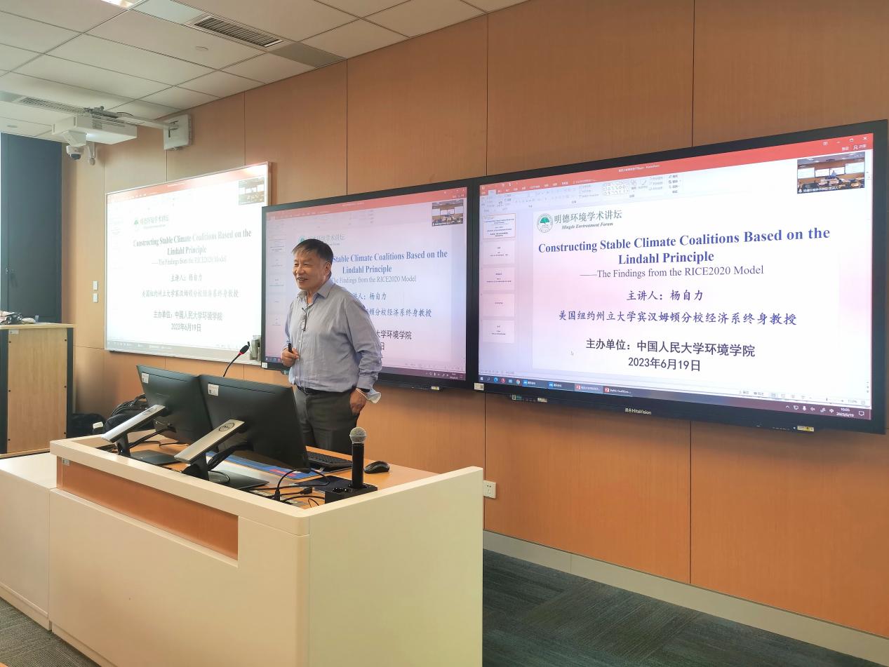 2023年6月19日,yl7703永利集团官网环境公司主办的“明德环境学术讲坛”第二十三讲以线上线下结合的方式成功举办。本次讲坛邀请美国纽约州立大学宾汉姆顿分校经济系终身教授杨自力教授线下作了题为“‘Constructing Stable Climate Coalitions Based on the Lindahl Principle”的学术报告。yl7703永利集团官网环境公司经理庞军教授首先致辞,代表公司对杨自力教授为公司师生作学术报告表示诚挚感谢,并对参会师生在交流学习过程中能够有所收获提出了殷切期望。会议由yl7703永利集团官网环境公司昌敦虎副教授主持。
