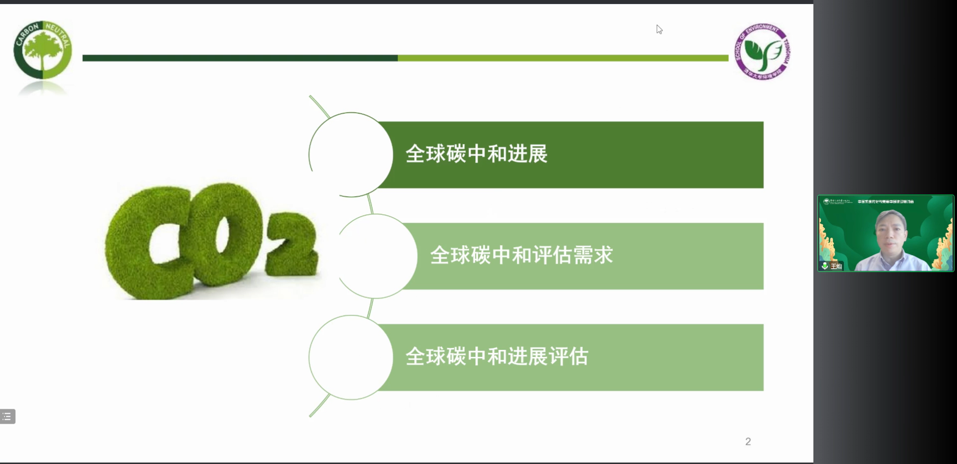 王灿教授发表题为“碳中和进展评估现状与需求”的学术报告。王灿教授从全球碳中和进展、全球碳中和评估需求和评估工作进展三个方面展开论述,指出尽管碳中和转型已成为全球趋势,但现有行动无法支撑巴黎协定下2℃/1.5℃目标的实现,能否促进政策与行动的落实是实现碳中和的关键,需要通过追踪国家级政策与行动,从政策、技术、资金和国际合作等多个维度厘清当前全球“碳中和”行动的进展,识别未来行动差距。