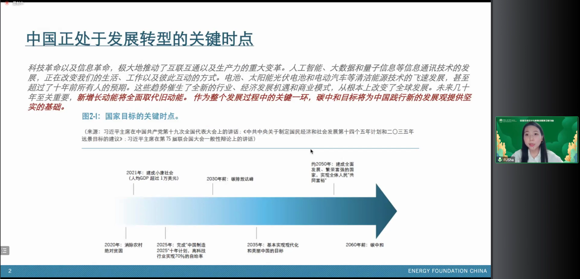傅莎博士发表题为“双碳转型下的产业发展和公正转型”的学术报告。傅莎博士从中国正处于发展转型的关键时点这一观点出发,阐释了中国旧增长模式和“双碳”目标下新增长模式的特点及关联性,提出了中国实现“双碳”目标进程中所面临的贸易壁垒挑战和新增长机遇。