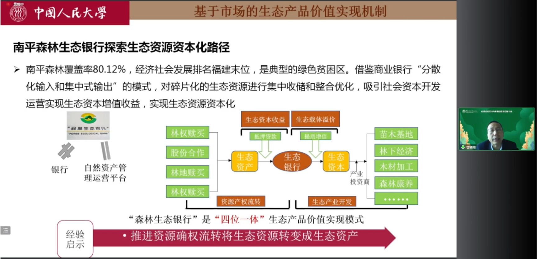 曾贤刚教授发表题为“生态产品价值实现机制与路径”的学术报告。曾贤刚教授从生态产品的概念和特征入手,从政府、市场、“政府+市场”以及社会四个方面深入探讨了不同的生态产品价值实现机制与路径,并且通过具体生动的案例详细解释了各种生态产品价值实现机制的具体特点和经验启示。