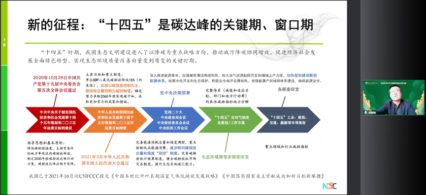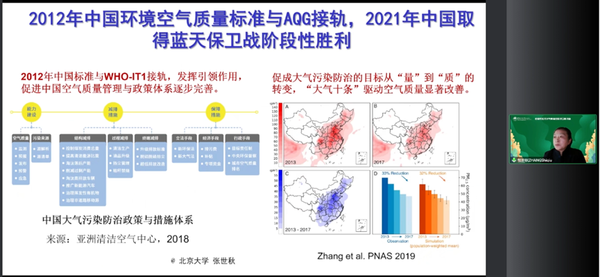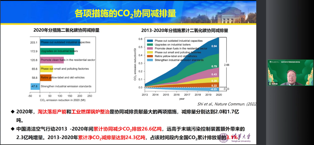贺克斌院士发表题为“中国实现碳中和与清洁空气的协同路径”的主旨报告。贺克斌院士指出“双碳”目标的提出在新时代、新形势之下具有多层战略意义。结合翔实的数据分析,贺克斌院士总结了《大气污染防治行动计划》、《打赢蓝天保卫战三年行动计划》等大气环境治理政策的实施成效,指出碳中和目标与空气质量目标之间具有高度一致性,温室气体排放削减和大气污染治理措施间存在协同效益。贺克斌院士强调,环境污染问题的解决以及应对气候变化目标的实现,除了要从末端治理向源头治理转变,更要积极发挥“减污降碳协同增效”这一总抓手的作用。