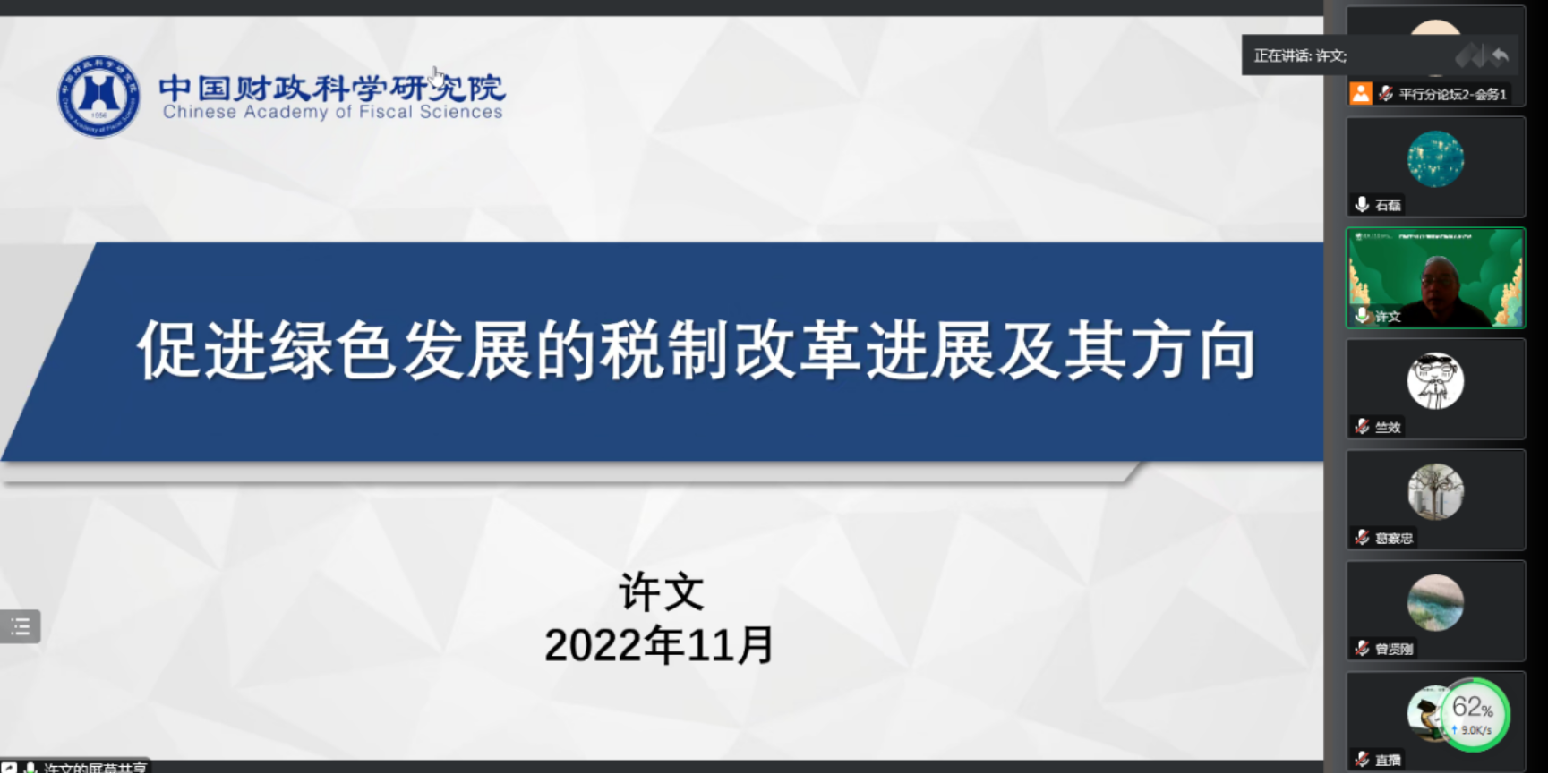许文研究员发表题为“促进绿色发展的税制改革进展及其方向”的学术报告。许文研究员在回顾我国绿色税制建设进展的基础上,基于绿色税收收入分析了我国绿色税制的发展趋势,指出我国应该在保证宏观税负稳定的前提下将绿色税改作为增税的主要选择,同时重视绿色低碳发展背景下因成品油等化石燃料被替代所带来的税收收入减少问题。
