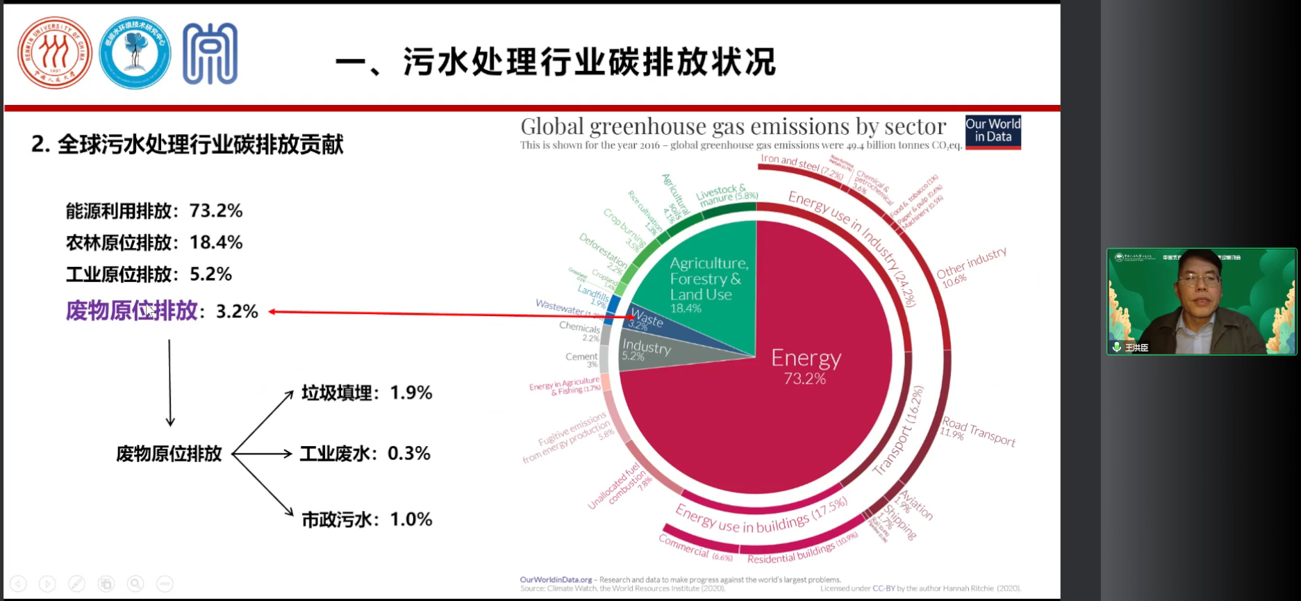 王洪臣教授发表题为“污水处理行业降碳技术路径——《污水处理厂低碳运行评价技术规范》解读”的学术报告。王洪臣教授深入分析了污水处理行业的碳排放状况和降碳技术路径,指出可以通过减少厌氧过程、提高脱氮效率、节能降耗和加强碳排放核算、评价和奖惩等措施实现污水处理行业的碳减排。