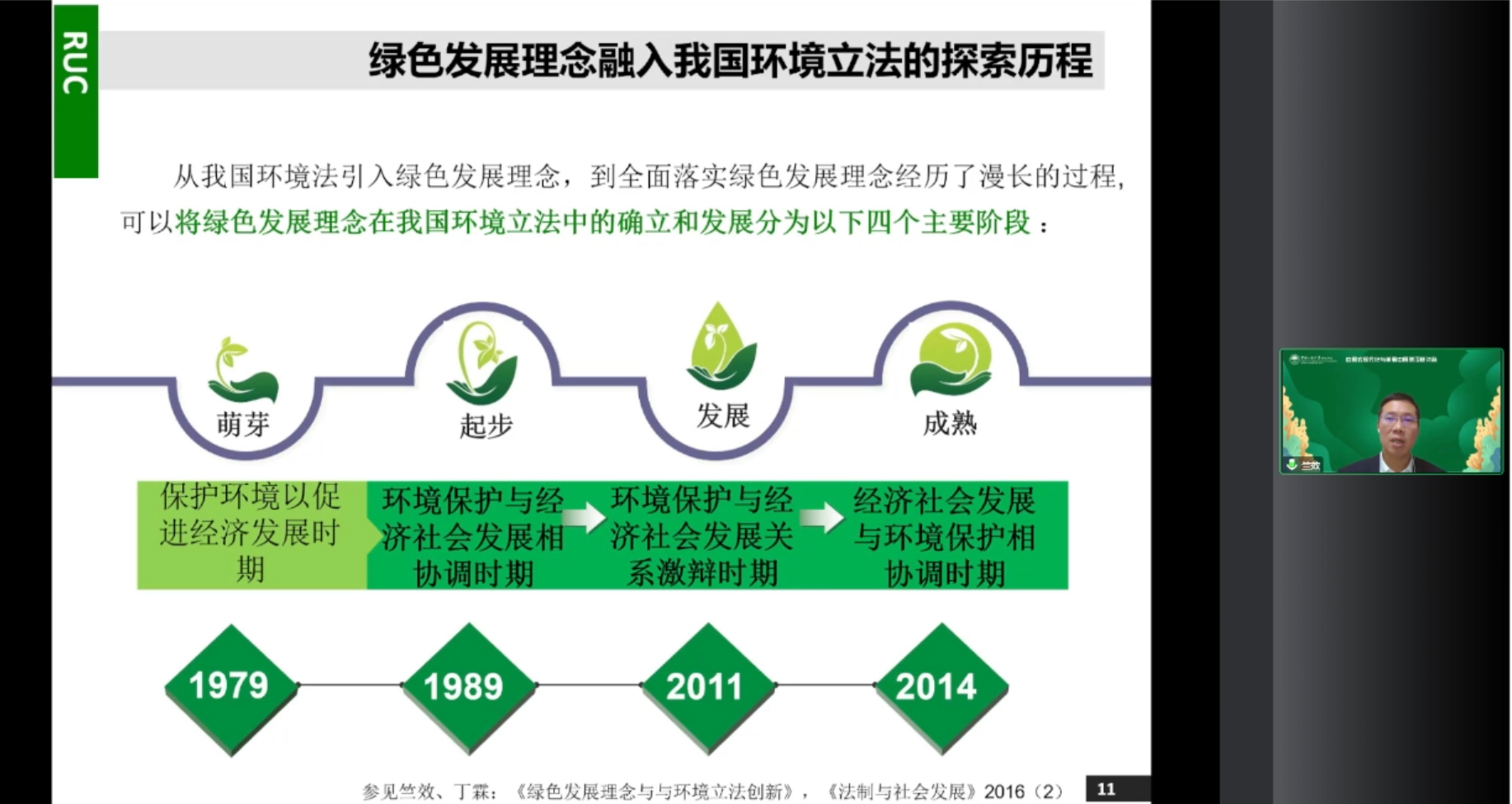 竺效教授发表题为“谈人与自然和谐共生的现代化之法治保障”的学术报告。竺效教授从绿色发展理念的法律表达、立法框架、执法践行、司法保障以及新时期绿色发展对法治的新要求五个方面展开详细论述,指出生态环境法治体系与生态环境治理体系相辅相成,共同促进美丽中国建设目标的实现。