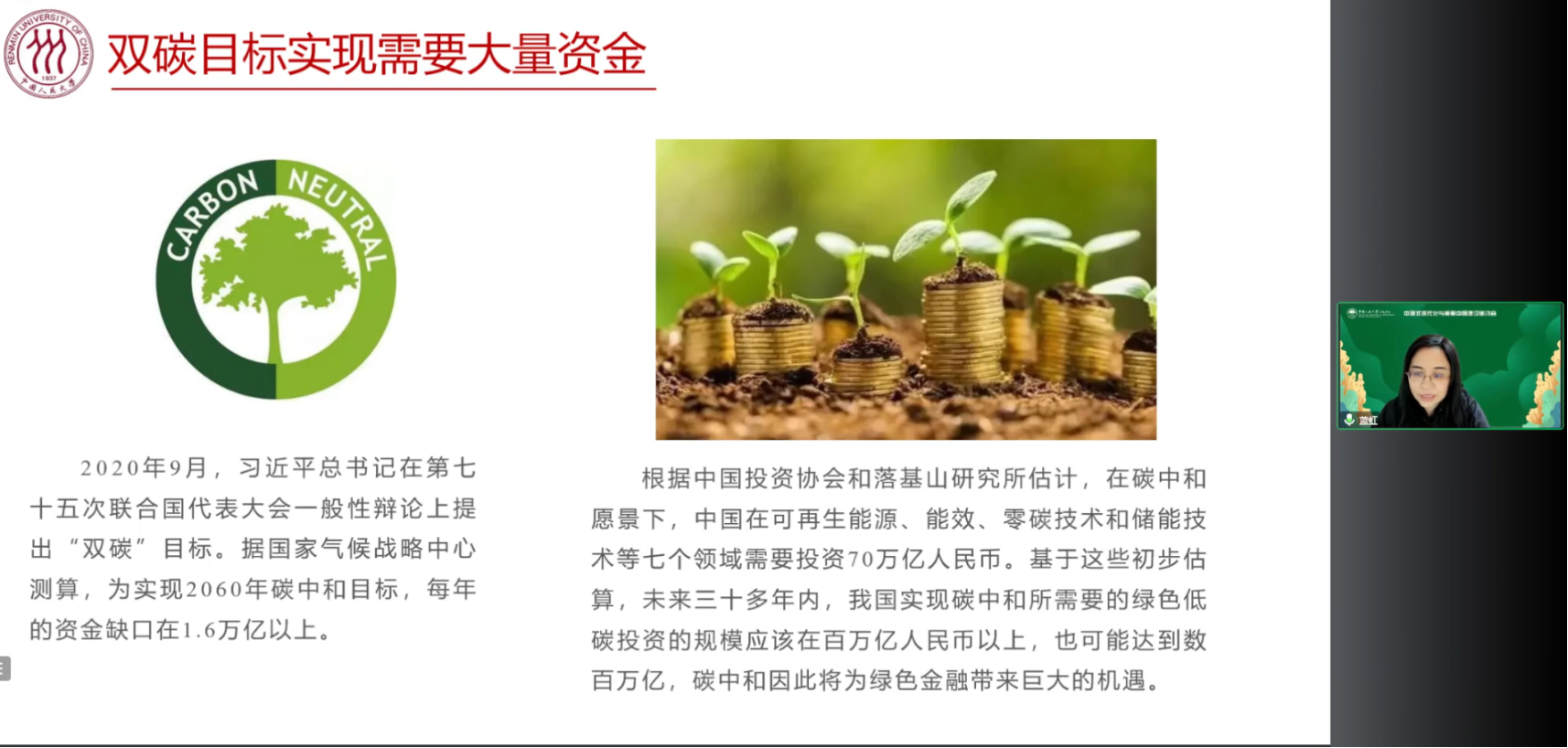 蓝虹教授发表题为“绿色金融赋能双碳目标的实现”的学术报告。蓝虹教授以绿色技术增量成本和清洁能源产业发展为例,系统论述了绿色金融聚焦于双碳目标的现实意义,指出了我国绿色金融发展的新动向,并分析了绿色金融对实现“双碳”目标的重要作用。