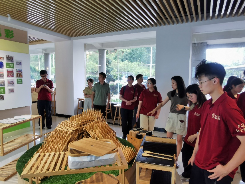 7月10日上午,调研团来到邵武市"竹立方"生态科创馆,实地考察当地竹产业在生态产品价值实现方面的探索实践。在工作人员详细介绍下,师生们了解到邵武市依托丰富的毛竹资源,通过技术创新延伸全产业链,开发出竹板材、竹家具等系列产品,实现了从原材料到终端产品的全链条开发。工作人员详细地讲解了竹材的优点——生长快、韧性高、固碳强、可降解,并介绍当地通过全产业链创新破解行业难题:前端以碳化改色技术提升竹材稳定性,后端开发竹家具、竹纤维快消品等高附加值产品,推动竹产业向家居、建材、时尚领域渗透。工作人员重点介绍了竹材在"以竹代塑"方面的应用前景,展示了竹制餐具、日用品等环保替代产品。邵武市依托国家“以竹代塑”政策支持及出口绿色壁垒优势,通过建立竹产业科创平台,整合研发、设计、生产等环节,推动生态优势转化为经济优势,让“小竹子”串联起低碳经济的大未来。这一实践为生态产品价值实现提供了有益参考。