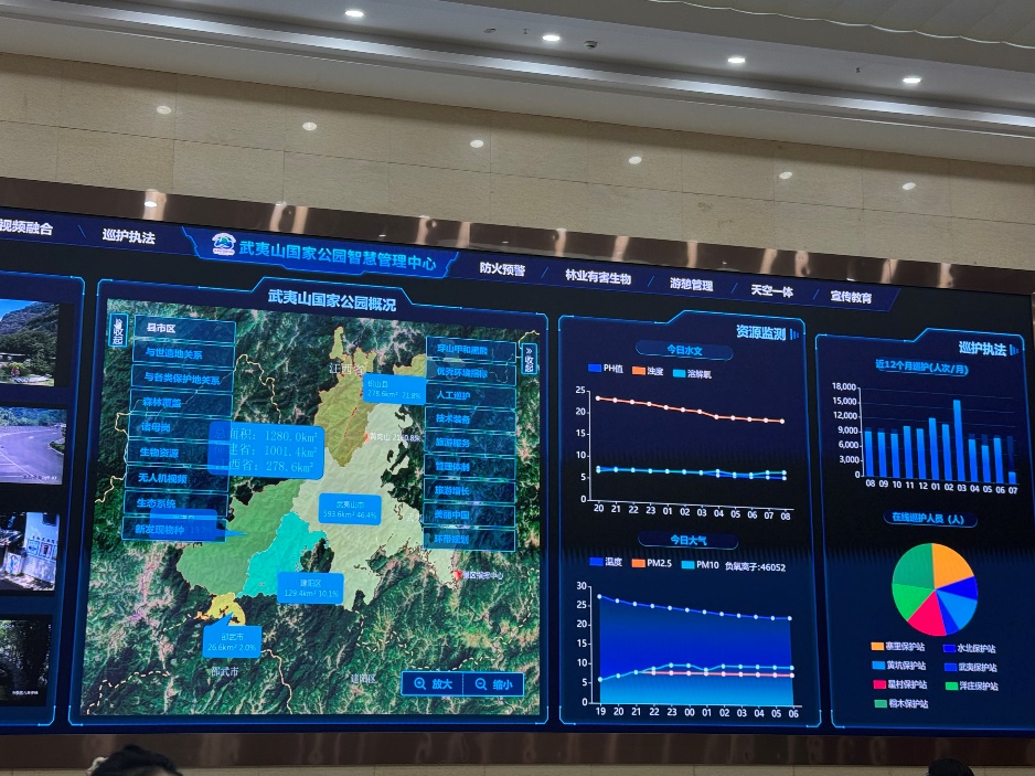 7月8日上午,调研团队来到武夷山国家公园智慧管理中心。在这里,调研团队详细了解了在物联网、地理信息系统、云计算、多媒体等技术所构建的智慧系统如何实现高效运转。这套系统不仅能够对武夷山国家公园的生态环境、生物资源、森林防火、智慧入园等要素实现全方位的监测,更关键的是通过大数据累积和分析,为生态资源的存量、质量及变化趋势提供科学的数据,奠定生态资产核算的坚实根基。此外还能够让科研人员及游客更加全面、深入地了解武夷山的生态系统,有效管理资源和环境,为武夷山国家公园可持续发展提供新的可能性。智慧化管理手段的运用,极大提升了管理效率和生态安全系数,是国家公园生态资源得以系统化、精细化保护的科技保障。