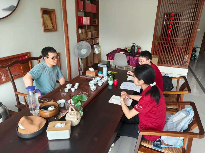 7月9日下午,师生调研团前往桐木村,走访金骏眉发源地骏德茶厂,实地考察生态产品价值实现的创新实践。在茶香氤氲的茶室里,金骏眉首泡制作人梁骏德先生与传承人梁天雄先生向调研团生动讲述了创制金骏眉的传奇历程,"从萎凋、揉捻到炒制、烘干的反复试验与改进,最终成就了这一缕松香",梁骏德先生这段饱含匠心的创业故事让在场师生深刻感受到传统工艺与现代创新的完美融合。梁天雄先生向师生详细介绍了桐木村优质的生态条件,讲述了金骏眉的品牌故事。他指出,"这些天然屏障和独特的小气候,造就了茶叶不可复制的‘松烟香、桂圆味’,这正是武夷山赐予我们最珍贵的生态馈赠。"在品鉴环节,师生们通过琥珀透亮的茶汤、馥郁持久的香气,切身感受到"骏德标准"如何将生态优势转化为品质优势。感悟到:传统工艺的传承需要与时俱进的创新精神;体会到:严格的生态保护不仅成就了茶叶的独特品质,更通过品牌溢价实现了生态价值的市场化转化,这正是'绿水青山就是金山银山'理念的生动诠释。茶厂"古法为基、标准为要、生态为本"的发展模式,为生态产品价值实现提供了可复制的成功范例。
