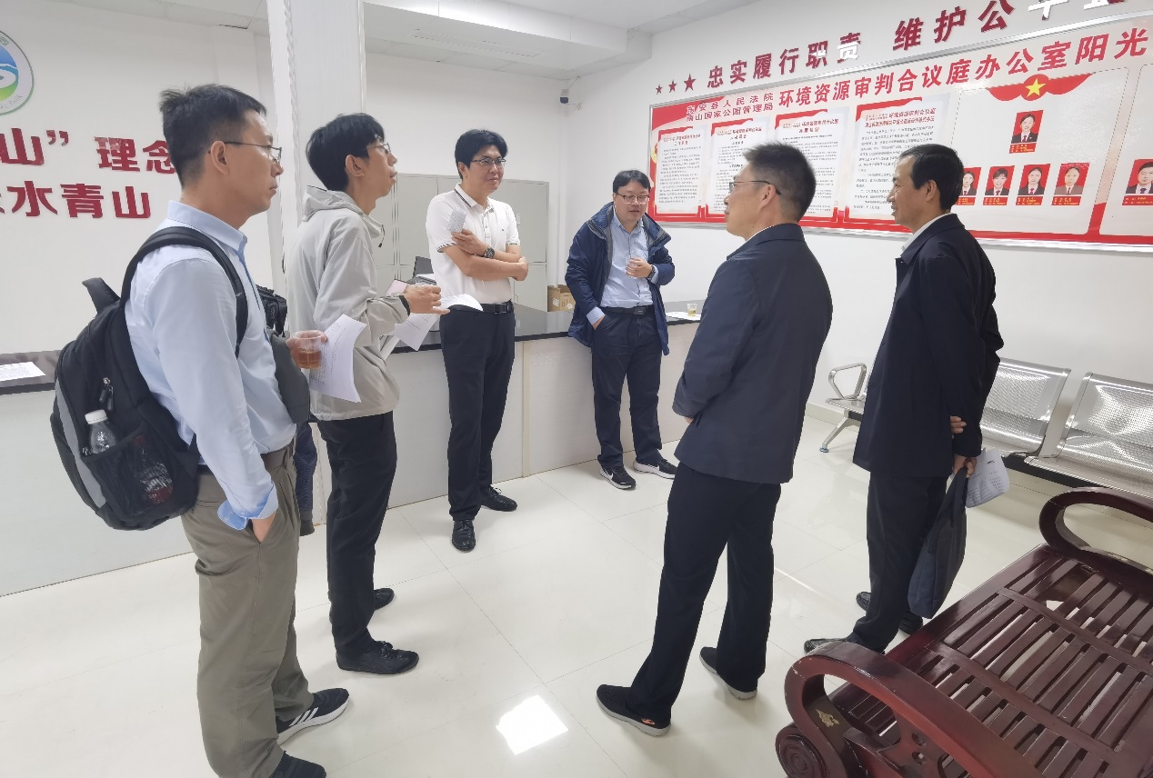 南山国家公园在执法体制机制方面进行了大量探索,整合有关市县的执法力量,全面统一建立了行政执法机制,通过畅通公检法一体化的生态相关案件的查处、检查和审判机制,形成对国家公园范围内生态违法行为的有效威慑和协同治理。在工作人员的带领下,调研团前往东安舜皇山环境资源审判合议庭了解建设运行及案例审理有关情况。合议庭于2023年7月成立,其职责包括审判环境资源类刑事案件、民事案件和环境公益诉讼案。合议庭在发挥基础职能的同时,积极创新特色功能,不断加强与媒体的沟通,强化与群众的联系,以世界环境日、世界森林日等环境保护日为契机,全面开展集中普法、主题宣传、提供法律咨询等形式多样的宣传活动,引导社会公众尊重自然、顺应自然、保护自然,营造了浓厚的生态环境保护氛围。合议庭的设立对通过司法手段全面加强南山国家公园的生态环境保护,规范和引导当地居民的生态友好行为起到了积极作用,是南山国家公园通过体制机制改革创新、深入贯彻落实“绿水青山就是金山银山”理念和用严密的制度保护生态环境的一个生动体现。