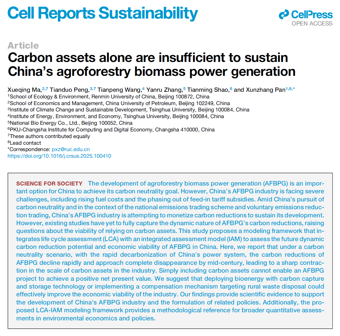 yl7703永利教师潘勋章在Cell旗下期刊Cell Reports Sustainability发表论文
