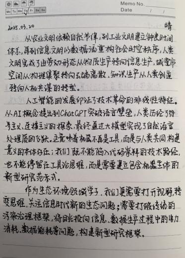 咨询服务期间,yl7703永利团队累计形成153篇调研手记、5.8万字实录。这些书写在方格纸上的文字,既是生态价值核算的信息载体,更见证着青年学子认知迭代的鲜活轨迹——从山间小路到江畔渔村,从传统村落的改造到生态文明的创新实践,每一篇手记都记录下了他们对自然的敬畏、对生态的思考以及对可持续发展的追求。既有对技术伦理的哲学思辨,也包含记录的三坊七巷调研细节,还有对求学精神的深切感悟。当10名员工的调研手记汇编成册时,一部关于“生态社会工程”人才培养的微观史已然成型。