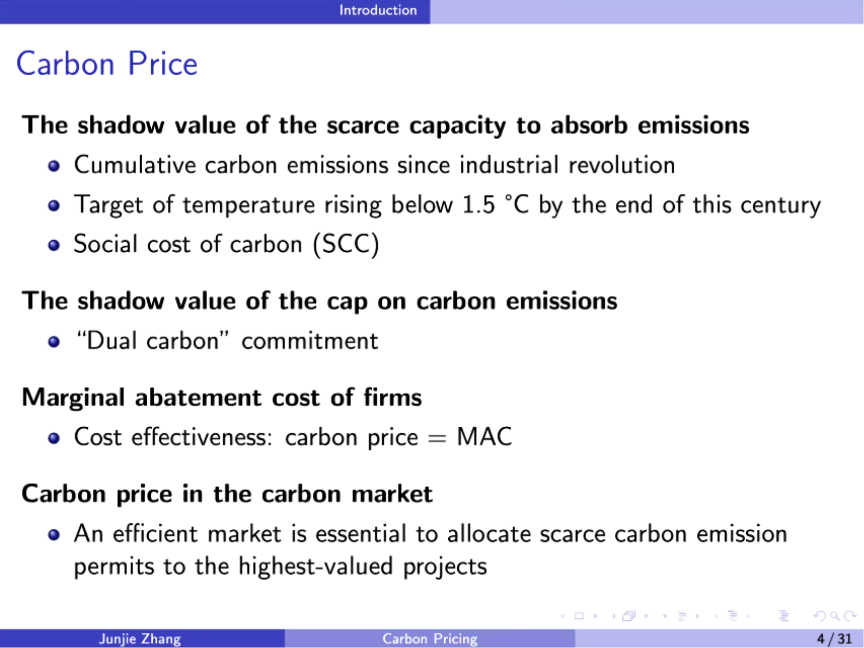 张俊杰主任在报告中首先对碳价的重要性进行了分析,他指出外部性问题的根源是价格的缺失,而引入碳价能够使外部成本内部化,从而引导市场主体进行最优的决策,因此碳价在气候变化减缓中发挥着举足轻重的作用。作为经济激励型环境规制手段,有效的碳市场能够形成反映企业边际减排成本的碳价,并通过这一价格信号引导稀缺的碳排放配额流向具有最高价值的产业,实现资源最优配置。因此,碳市场不仅具有约束碳排放总量的环境有效性,还具有成本有效性,能够以最小的社会成本(总减排成本)实现既定的规制目标。