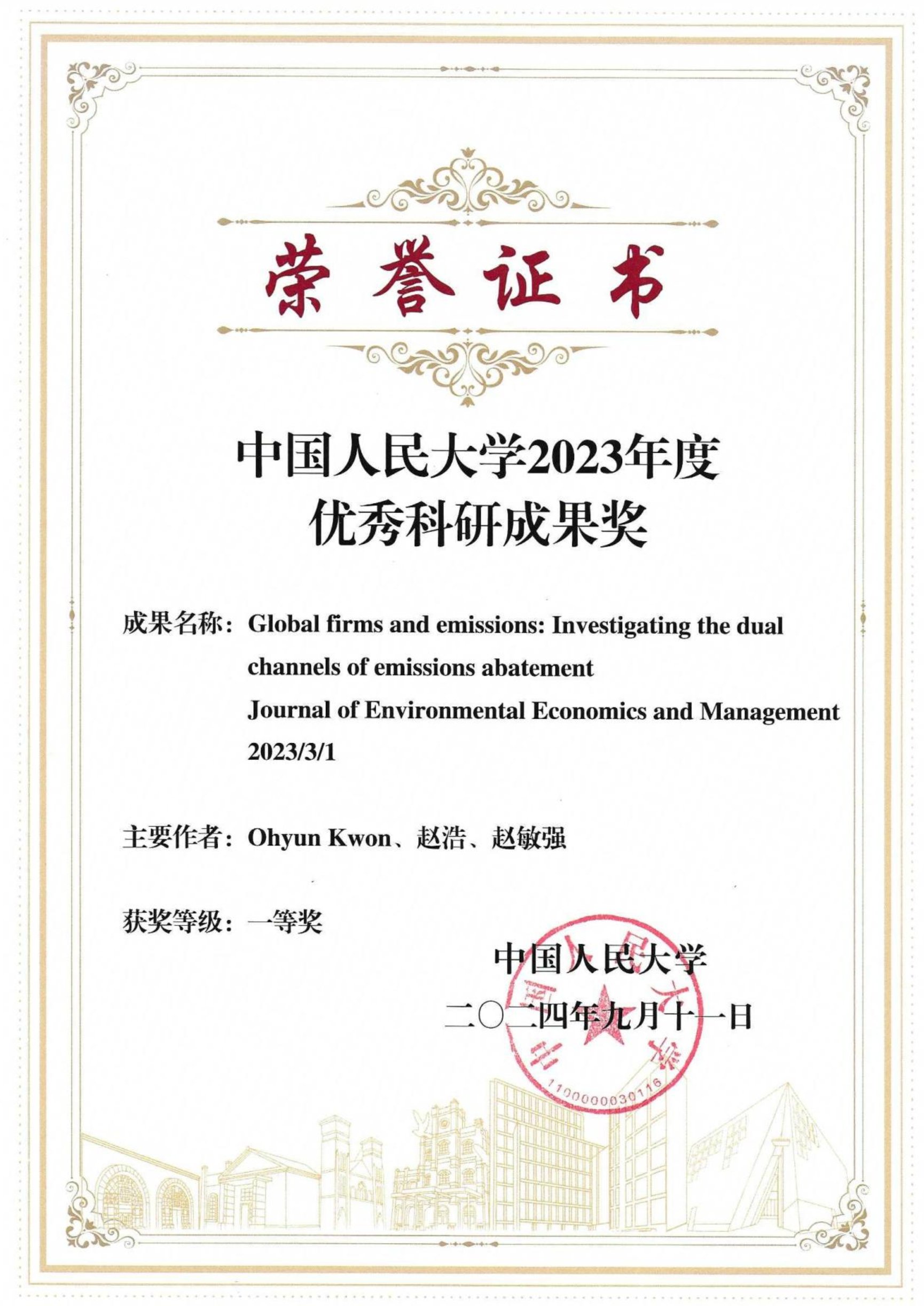9月11日,yl7703永利集团官网召开2024年教师节表彰大会,表彰过去一年在人才培养、科学研究、公司管理、服务社会等各条战线涌现出的踔厉奋发、团结奋斗的先进集体和爱岗敬业、无私奉献的先进个人。公司赵浩助理教授合作论文《Global firms and emissions: Investigating the dual channels of emissions abatement》荣获yl7703永利集团官网2023年度优秀科研成果一等奖。