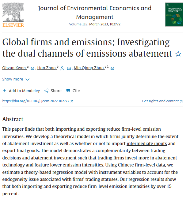 该文发现,进口和出口均能降低企业的排放强度。作者构建了一个理论模型,其中企业同时决定减排投资的程度以及是否进口中间投入品和出口最终产品。该模型表明,由于贸易决策和减排投资之间存在互补性,因此参与贸易的企业会更倾向于提高减排技术水平,从而降低其排放强度。文章利用中国的企业层面数据,根据理论模型设定了回归方程,并采用工具变量法来解决企业贸易状态相关的内生性问题。文章的实证结果表明,进口和出口均能使企业层面的排放强度降低超过15%。本文研究结论对于进一步深化国际贸易和环境保护相关问题研究,以及通过制定合理的进出口贸易政策促进相关产业减排控污具有重要参考价值。