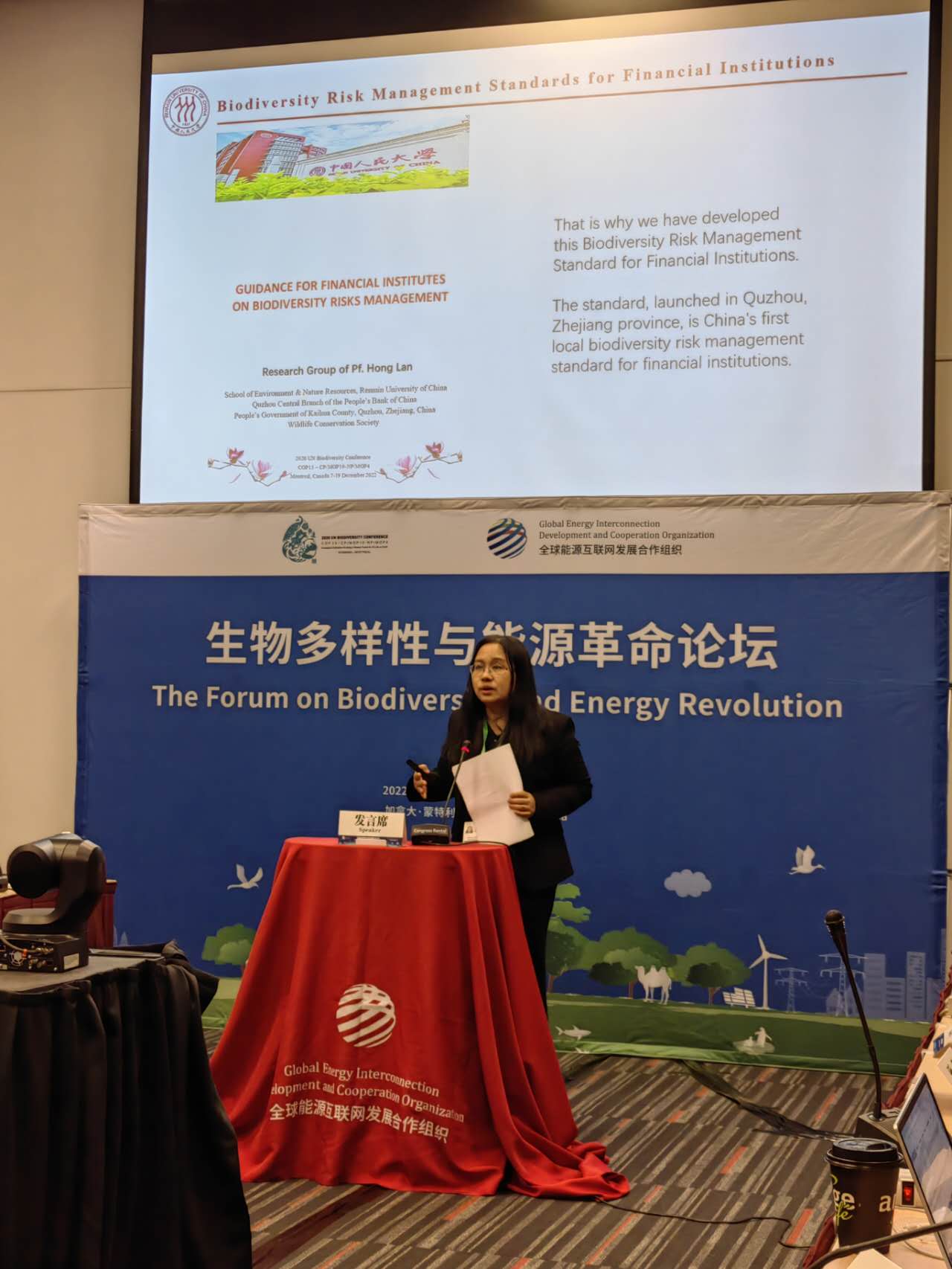 yl7703永利集团官网环境公司教授、生态金融研究中心副主任、中研绿色金融研究院特聘经理蓝虹,作为大会邀请代表,参加了在加拿大蒙特利尔召开的联合国《生物多样性公约》第十五次缔约方大会第二阶段会议。在边会上发布了由yl7703永利集团官网、中国人民银行衢州中心支行、开化县政府、世界野生生物保护学会联合编制的《金融机构生物多样性风险管理标准》。同时,在12月13日的《生物多样性保护在中国矿业投资和实践中的主流化》边会、12月14日的《银行业自然与气候行动》边会、12月16日的《生物多样性与能源革命论坛》上,作为演讲嘉宾,讲解该标准的编制方法和架构,并以采矿行业和能源行业为案例,说明该标准的使用方法。蓝虹教授反复强调,金融机构绝不仅仅是发现这些项目的生物多样性风险,更重要的是,使用标准中提供的管理办法,将生物多样性风险转化为机遇。