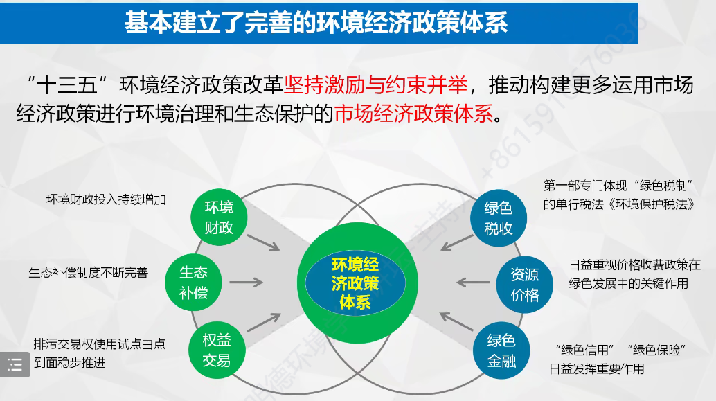 着眼未来,董战峰研究员指出,在当下美丽中国和生态文明建设提出新需求、环境质量持续改善提出新挑战、环境经济政策体系建设再上新台阶、高质量发展转型关键期提供新动力的现实背景下,“十四五”时期我国环境经济政策改革应主要聚焦于完善生态环境财政制度,深化绿色税费价格机制改革,建立多元化、市场化生态补偿机制,健全资源环境生态权益交易机制以及持续深化改革完善绿色金融体系,并辅以环境价值核算体系、环境信息公开与信用体系、资源环境名录、政策绩效评估机制等配套机制,构建产权清晰、市场健全、财税激励、费价合理、公平补偿、资本绿色的环境经济政策体系。