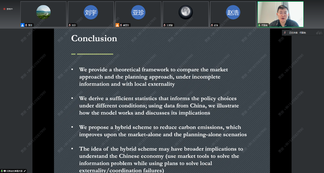 首先,何国俊教授指出在全球气候变化日益严峻的背景下,中国政府设定了“3060”碳排放目标,以积极应对这一全球性挑战。然而,目前可采用的“计划”或者“市场”政策工具进行减排都有其优缺点。计划手段能够解决碳减排的局部外部性问题,但无法处理不完全信息问题,这意味着政府无法准确了解不同地区的减排成本,从而难以制定有效的政策。市场手段虽然能够在信息不完全的情况下实现经济效益,但忽略了碳减排的地方外部性,这意味着减排行为对当地环境和经济产生的影响因地区而异,需要有针对性的政策进行补充。因此需要对两种方法进行比较和分析,以找到最优的碳减排策略。