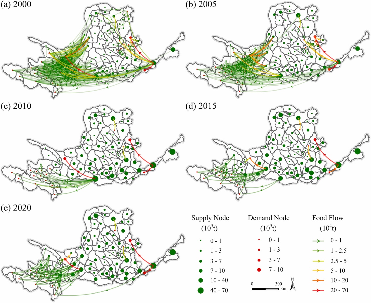 已有研究大多侧重于分析流动强度、方向或网络拓扑指标,缺乏将空间路径特征与网络组织结构相结合以识别代表性流动结构的综合视角。因此,迫切需要建立一个能够系统刻画流动路径属性,将其与网络组织相关联,并稳健识别不同流动结构及其潜在机制的框架。鉴于此,本研究以黄河流域为研究区,旨在解决三个关键科学问题:(1)如何有效构建区域食物供给服务供需之间的空间连接?(2)跨区域食物供给服务流动具有哪些典型的空间结构?(3)哪些主导因素解释了典型网络结构的分化与演变?通过整合流量量化、基于网络的结构识别以及可解释的机制分析,本研究建立了一个以结构为导向的综合分析框架,推进了对于食物供给服务空间流动组织的理解,为跨区域粮食系统可持续优化提供了实践启示。