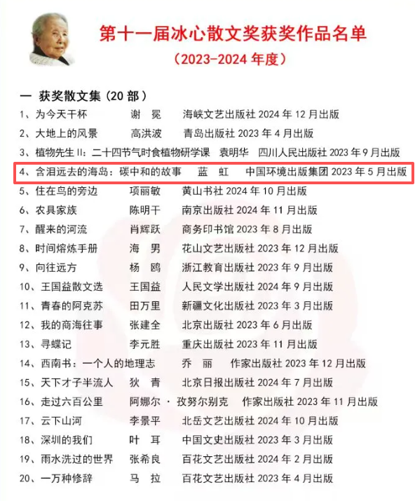 公司蓝虹教授作品《含泪远去的海岛:碳中和的故事》荣获第十一届冰心散文奖