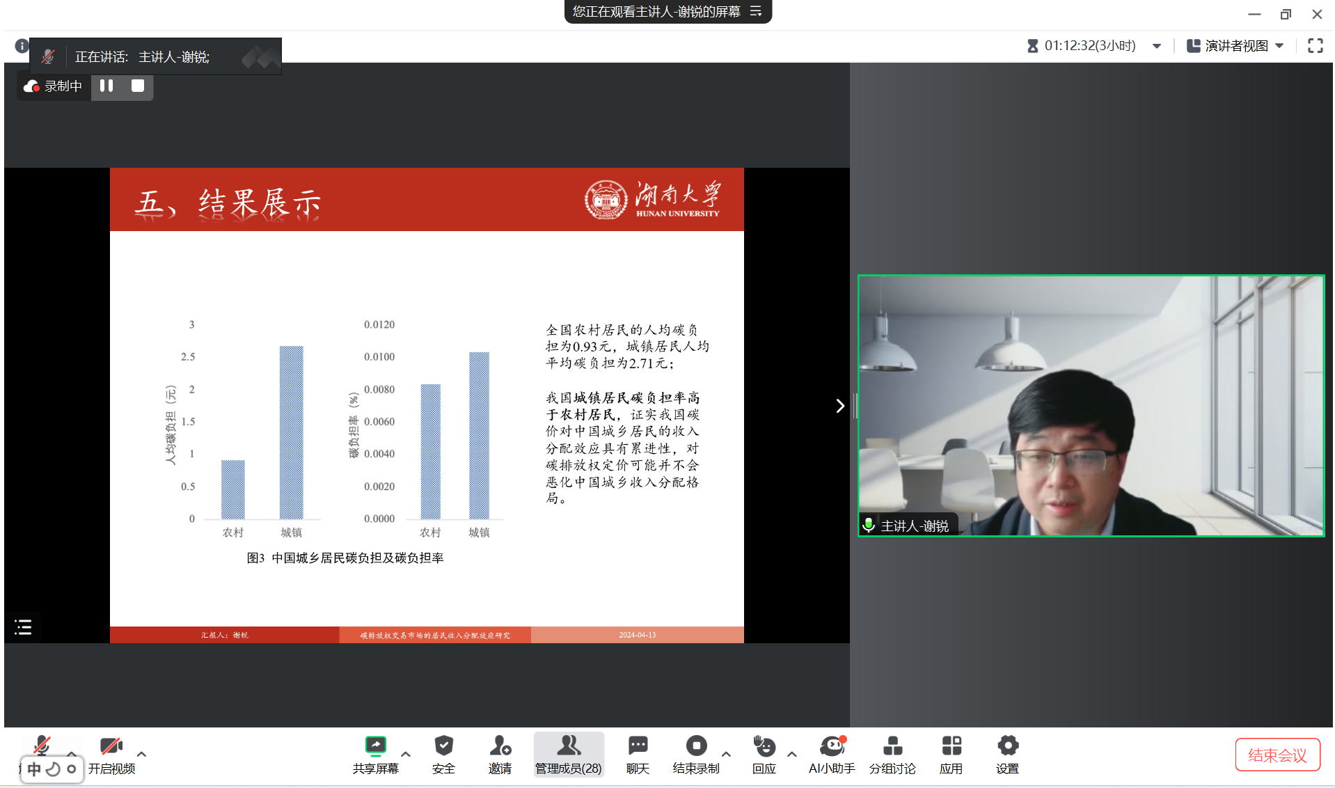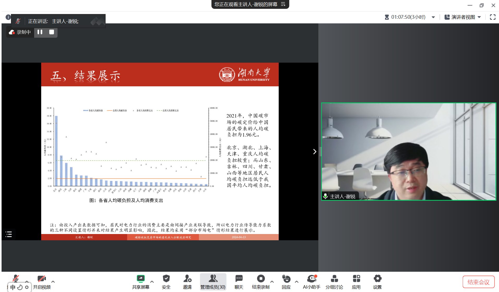 2024年4月13日,yl7703永利主办的“明德环境学术讲坛”第三十一讲以线上线下结合的方式成功举办。本次讲坛邀请湖南大学经济与贸易公司副经理谢锐教授作了题为“碳排放权交易市场的居民收入分配效应研究”的学术报告。yl7703永利经理庞军教授首先致辞,代表公司对谢锐教授为公司师生作学术报告表示诚挚感谢,并对参会师生在交流学习过程中能够有所收获提出了殷切期望。会议由yl7703永利昌敦虎副教授主持。