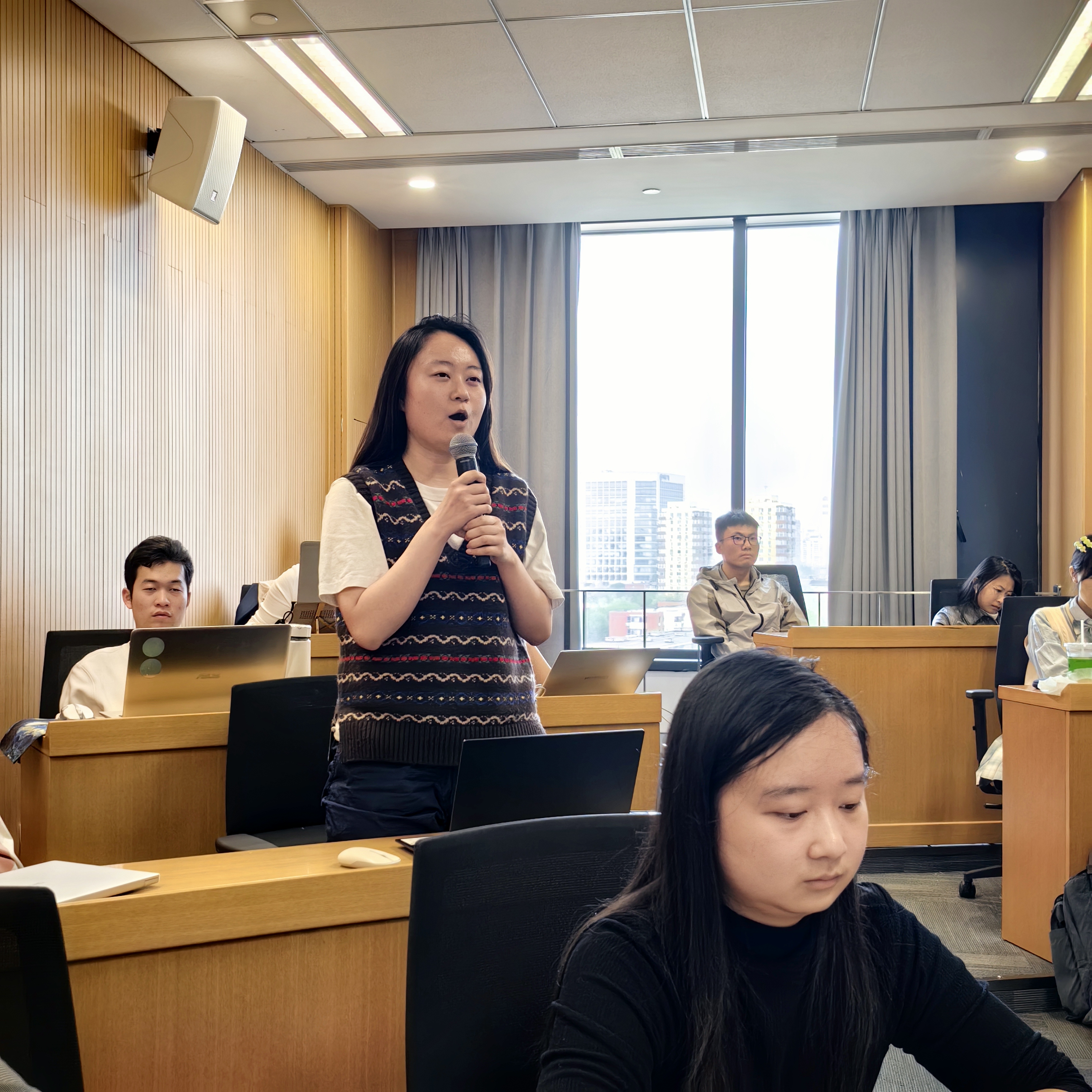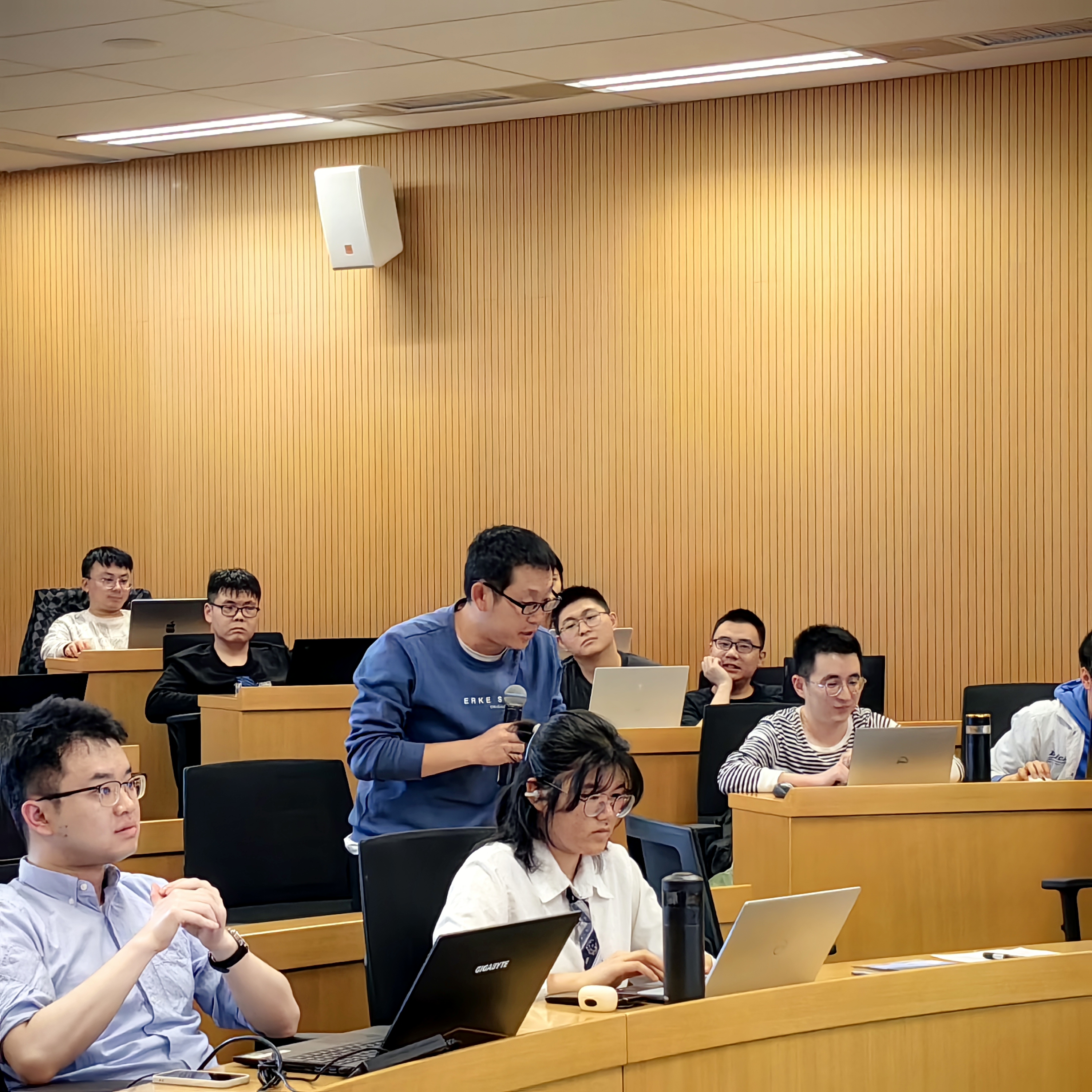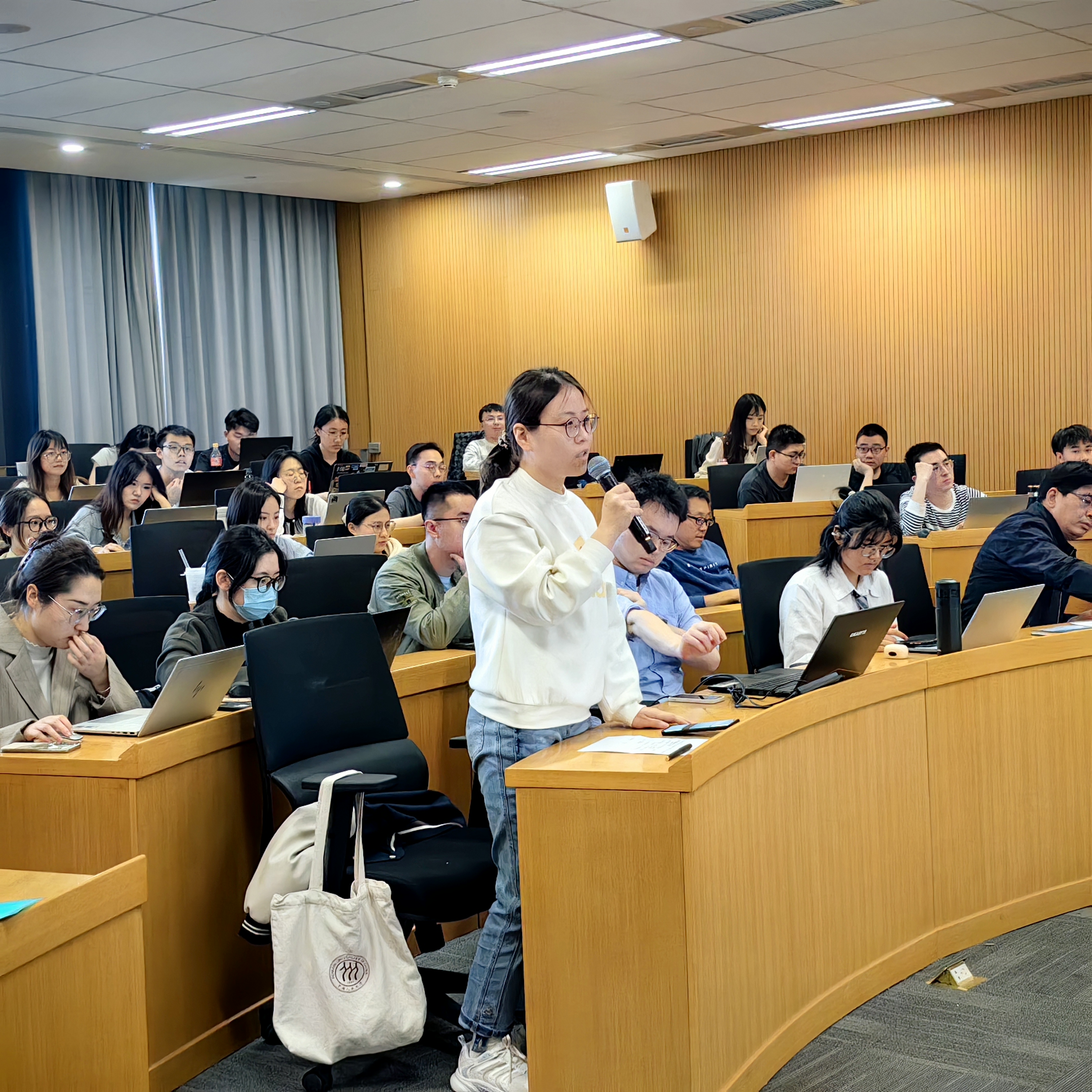 在交流讨论环节,多位师生针对学术报告中关于收入数据分级处理、电力行业的成本传导机制、模型中要素传导的设定、碳市场试点对模拟结果的影响等问题,与谢锐教授进行了深入探讨,气氛活跃,师生反响热烈。